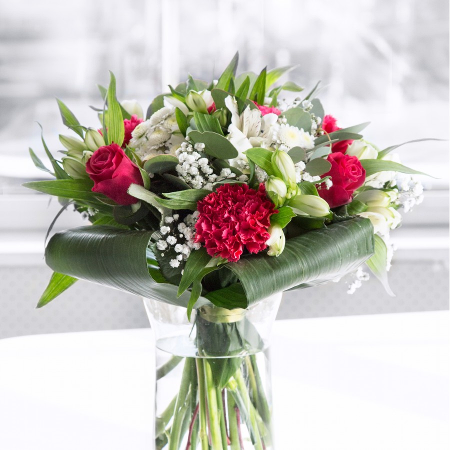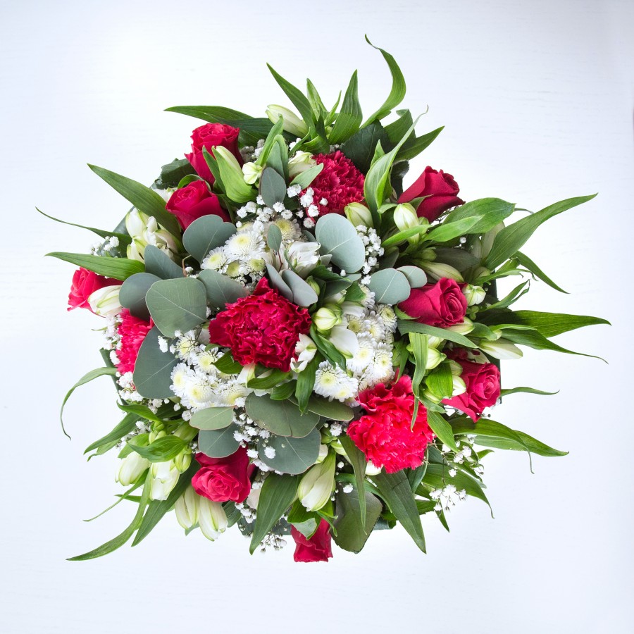 Celebrate love with our Radiant Red Romance bouquet. Featuring sumptuous red roses intertwined with pure white chrysanthemums and fluffy gypsophila, complemented by elegant alstroemeria and vibrant carnations.